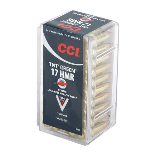 Caliber: 17HMR Bullet Type: Lead Free Hollow Point Bullet Weight: 16GR Muzzle Energy: 222 ft lbs Muzzle Velocity: 2500 fps 50 Rounds Per Box