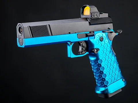The EMG Custom 2011 HI-CAPA series are hand crafted and tuned with full CNC components for the true Hi-CAPA enthusiasts and collectors. Installed full CNC steel and aluminum components includes the lower frame, mid-frame, slide, trigger, magazine release, safety, mag-well, magazine base, hammer, down to the screws used. Each EMG custom 2011 features a minimalist optic ready utility slide ready for you to outfit this with your favorite optic. All major components used to construct this handgun are professionally anodized to provide the scratch resistant surface that is a beauty at the same time. Your EMG Custom Hi-capa will be completed with a hard carrying case featuring plug-away foam, a green gas Hi-CAPA magazine (Co2 magazines also available and sold separately), CNC high performance fixed outer barrel, and may require you to activate (break-in) by firing 10~20 more magazines of bbs for optimal performance.
