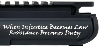 This custom engraved M4 flat top upper receiver is machined to Military Specifications and comes precision engraved with a beautiful high contrasting image: “When Injustice Becomes Law Resistance Becomes Duty”.We use a leading industry 3-axis galvo fiber direct diode laser to produce a permanent etching into the AR15 anodizing that has incredible detail. Spruce up your AR-15 upper with one of our many engraving images and save big!