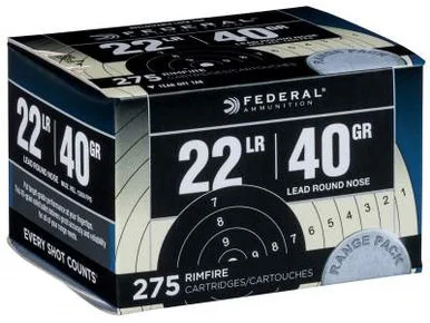 Federal Premium Ammunition offers 22 the convenience of ballistically matched Range & Field loads. The 275-round bulk packs offer convenience and economy while yielding improved accuracy for target and hunting applications. The target load features a consistent 40-grain lead round nose bullet that’s perfect for targets, while the field round offers an accurate 38-grain copper-plated hollow point suited for small game and varmints. Federal 22 Long Rifle Range & Field rounds provide nearly identical ballistics, reducing or eliminating the need to adjust sights when shifting between loads. Improved manufacturing processes have also enhanced the accuracy of both rounds. This ammunition is new production and non-corrosive.