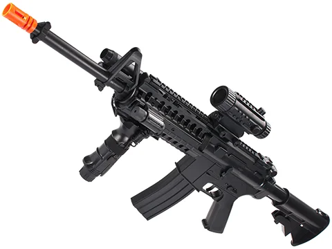 A great recreational Airsoft full size rifle for those looking for a recreational low power rifle that fires full automatic! The F4-D M4 Carbine comes with foregrip, flashlight, shoulder belt, laser, mock scope, battery and charger for a complete package ready to enjoy a great backyard skirmish!