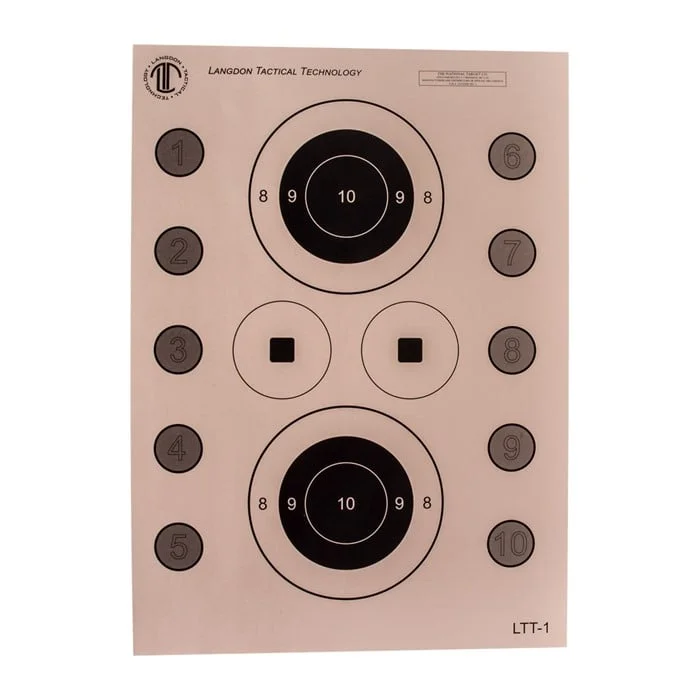 The Langdon Tactical Pistol Skills target was designed to allow shooters and firearms instructors to shoot several drills and or several relays without having to change targets.The design is a collaboration between Ernest Langdon and John M. from the LA Sheriff’s SEB team.The 2″ dots are there to privide fundamental accuracy drills that can be run at closer distances.The 2″ dots can also be used for standard multiple shot trigger control drills.The B-8 Bull’s Eye also privides an 8″ cicle area by using the 8 ring.This can be used to provide a larger aiming area for speed work at closer distances as well as the large aiming area for drills like “3, 2,1”.The 4″ circle with the 1″ square in the middle provide the additional aiming areas for “3,2,1” as well as making a great zero target even for scoped rifles and red dot optics.Your imagination is the only limit with this target and it is easy to get in a several hundred round practice session without changing targets.