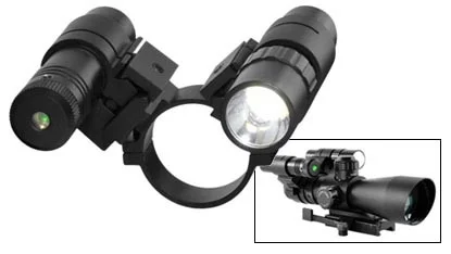 This Flashlight and Green Laser combo mounts right up to your NcStar Mark III Tactical Scope (or other scope that will accept a 34mm ring) to add laser sighting and a Flashlight in a compact tactical set up. 34mm Ring with two offset Picattinny style rails. Compact Bright 35 lumens flashlight is perfect for dark engagements or night shooting. Bright Compact Green Laser for Close Quarters and is highly visible in all light condition.