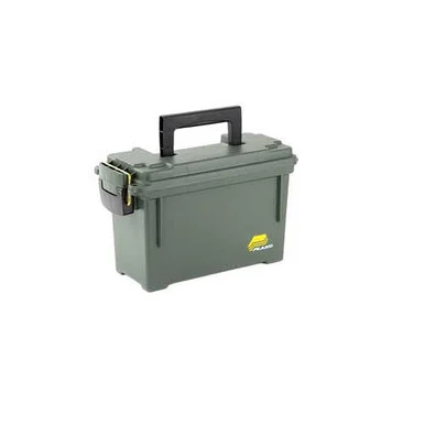 Plano Ammunition CanrKeep your ammunition safe and organized with this Plano Can Water-Resistant Ammo Box. It is made of durable, high-quality and water-resistant plastic. This Plano O-ring seal box secures firmly with a brass-bailed latch and has two holes in the lid through which you can place a lock to secure the contents. It also features heavy-duty handles for easy portability. Whether you are stocking up for a busy hunting season, organizing your ammo for easy access or storing it away for later, this sturdy box helps make the task easier.rrrrFeatures:rrType: ammo boxrStackable for easy storagerPlano, O-ring seal box for water-resistancerIncludes holes through which you can place a lockrSturdy carrying handlerFinish: olive drabrMaterial: polyethylenerHold 6-8 boxes of ammorDimensions: 11.63-inch x 5.13-inch x 7.13-inchrProofs: water-resistant constructionrHardware: brass-bailed latchrManufacturer’s part 131200