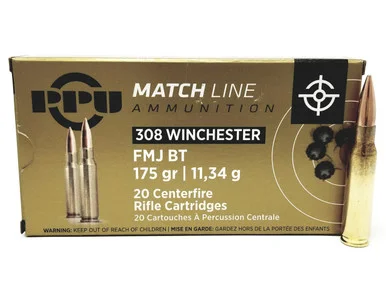 PPU’s Match line ammunition is designed for precise shooting at both short and long ranges. Its exceptional accuracy is the result of special production and control processes which demand holding very narrow tolerances. It uses reliable primers for extreme consistency and carefully chosen powders for loading, ensuring uniform ballistics. This 308 Winchester load features a 175 GR full metal jacket boat tail bullet and comes packaged 20 rounds per box, 10 boxes per case.