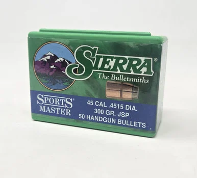 Designed for hunting, specifically for large bears, and for Handgun Metallic Silhouette competition with magnum calibers, this 300 grain #8830 Jacketed Soft Point bullet was introduced in 2004. Its construction ensures deep penetration on the largest game due to a heavy jacket and extremely hard 6% / 4% core. This is the heaviest bullet Sierra produces in the 45cal pistol lineup and should be used in a 45 Colt if penetration is a must, and it can work in the 454 Casull or similar cartridges easily. It has an established reputation in the game fields of North America and is considered to be the bullet for hunting dangerous game with a handgun. It is not, however, recommended for deer-size game because of its hardness. Because this bullet has a cannelure and can be roll-crimped, it may be loaded in cartridges and used in modern rifles with tubular magazines.