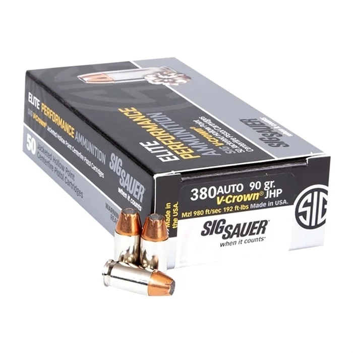 The SIG Sauer Elite V-Crown 380 Auto ammo with a 90-grain JHP bullet at 980 fps provides excellent self-defense performance. JHP bullets expand upon impact, offering greater stopping power and energy transfer. SIG Sauer is renowned for its innovative and reliable firearms and ammunition, trusted by military and law enforcement agencies worldwide.