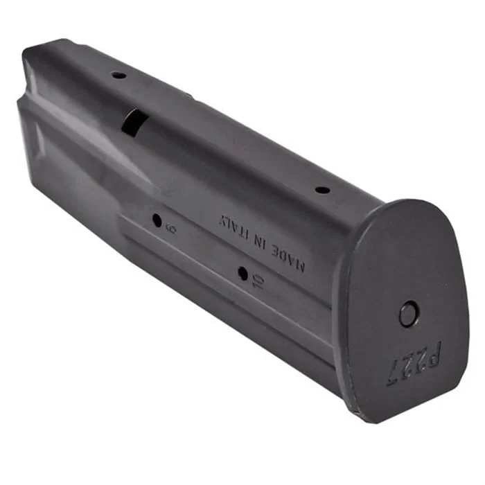Replacement factory magazine for the Sig Sauer P227 in .45 ACP holds an even 10-rounds for use in jurisdictions with magazine capacity restrictions. The Sig Sauer P227 .45 ACP 10-round magazine has a matte-blued steel body with witness holes indicating 10 and 6 rounds, a removable polymer base plate, and a self-lubricating polymer follower.The best way to ensure reliable feeding in your Sig Sauer P227 in .45 ACP is to have plenty of spare factory magazines on hand.