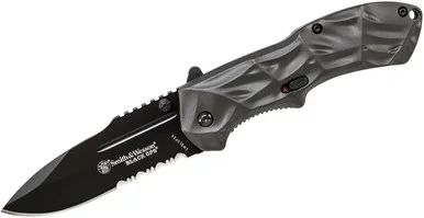 The Smith & Wesson® Black Ops Partially Serrated Knife is made of a black stainless-steel blade with ambidextrous thumb knobs, jimping. Its blood groove, ergonomic rippled and smooth black and red aluminum handle comes with a safety lock, lanyard hole and pocket clip.