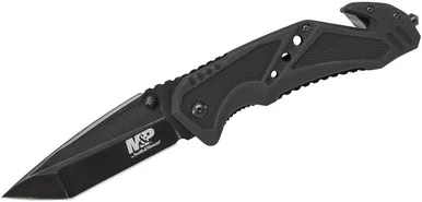 The Military & Police MP11B folding knife by Smith & Wesson features a 7Cr17MoV high carbon stainless steel tanto blade with ambidextrous thumb studs and a black finish. The aluminum handle has a checkered pattern, strap cutter, ceramic glass breaker, and also includes a pocket clip set up for right-hand, tip-up carry. It’s a tactical folder with a rescue style handle, making it great for on duty carry.