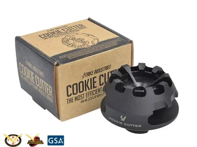 The Cookie Cutter Comp was designed to eliminate recoil force as much as possible. Hands down, it is one of the best muzzle brakes for SBRs and AR pistols. The Cookie Cutter has a larger surface area to minimize recoil substantially while compensating for muzzle rise, but it is NOT a flash suppressor. Be aware that there will be significant side concussion on any firearm equipped with the Cookie Cutter. It has a large single gas port to expel gases to the left and right, and its heavy duty, parkerized finished steel design makes the Cookie Cutter a durable piece of equipment that can even double as a glass breaker.
