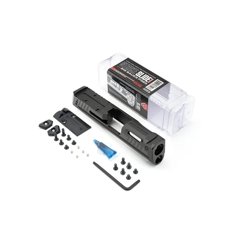 The SIG SAUER® P365 redefined what a concealed carry handgun should be. At the time of the P365 release, it had the best size to capacity ratio and quickly became one of the most popular daily Concealed Carry Weapons (CCW) on the market. The Strike Slide for SIG SAUER® P365 was created with function and form in mind, a perfect upgrade or new custom build. Made in the USA from machined billet 17-4 Stainless Steel to ensure strength and reliability, this Strike Slide weighs less than the factory production model, reducing the recoil momentum which allows faster and more efficient follow-up placement. The Strike Slide was proudly designed with durability and function in mind along with the Strike Industries stylings. Large enhanced aggressive front and rear serration areas aid in manipulating the slide to check the chamber or clear a jam along with the included left and right side charging handles located towards the rear of the slide. The two large port relief cuts will highlight any styled barrel and also provides a faster cycle time with its lightweight structure and improved air flow. The Strike Slide for SIG SAUER® P365 is pre-cut for Shield Standard and Docter/Noblex footprints, you are able to mount compatible Micro Red Dot Optics (MRDS) securely with ease without needing to send your slide out to get machined. Additionally, a removable cover plate with a built-in rear sight is included for those who do not want to use an optic. The Strike Slide comes with all necessary screws and posts needed for compatible red dots. The Strike Slide for SIG SAUER® P365 is truly an function and aesthetic upgrade or a great choice for a new custom build.