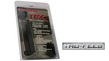 2 spare magazines for the Tippmann TiPX (TPX) Paintball Pistol. The Tru-Feed Design stacks 7 rounds straight inside the magazine. Self-Locking with quick release feed system.