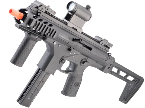 Beretta’s hot new PMX SMG is now available as a fully licensed replica 6mm GBB airsoft gun. With reliable green gas power, the Beretta PMX sends .20 gram BBs downrange at 345 FPS and has a 1,100 round-per-minute cyclic rate. Plenty of Picatinny rail is available on the top rail, sides and bottom for the airsoft accessories and optics of your choosing. The drop-free PMX magazine holds 48 airsoft BBs and has a locking follower making it easy to load the mag, flip-up iron sights are fitted to the top rail and the PMX can be operated with the stock extended or folded. There are no batteries or chargers to buy for this airsoft rifle. Just pick up a can of Elite Force Green Gas and a bottle of Bio BBs and you’ll be ready to hit the airsoft fields. The main body is made of tough, reinforced, fiberglass polymer that keeps the total weight low. It has a crisp blowback and recoil. The charging handle can be placed on either side and its side folding stock means you can make this airsoft rifle very compact. The included flip-up sights are removable and this PMX comes with a vertical lower grip that is also removable. To hone in your accuracy this rifle has an adjustable hop-up that can be found just inside the breech when the bolt is locked back. Lastly, it has built-in sling attachment points for easy field carry and deployment.