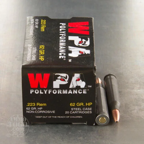 Stock up on Wolf ammunition in .223 Remington for your AR-15 or other .223/5.56 NATO rifle. These cartridges deliver reliable performance at a highly competitive price. Each round in this box of 20 fires a 62 grain hollow point bullet suitable for both hunting and target shooting. While the projectile uses a relatively simple design, it offers much better performance against game than FMJ rounds. External ballistics are comparable to M855 ball ammo. This ammunition is made in Russia using non-corrosive Berdan primers and non-reloadable steel cases.